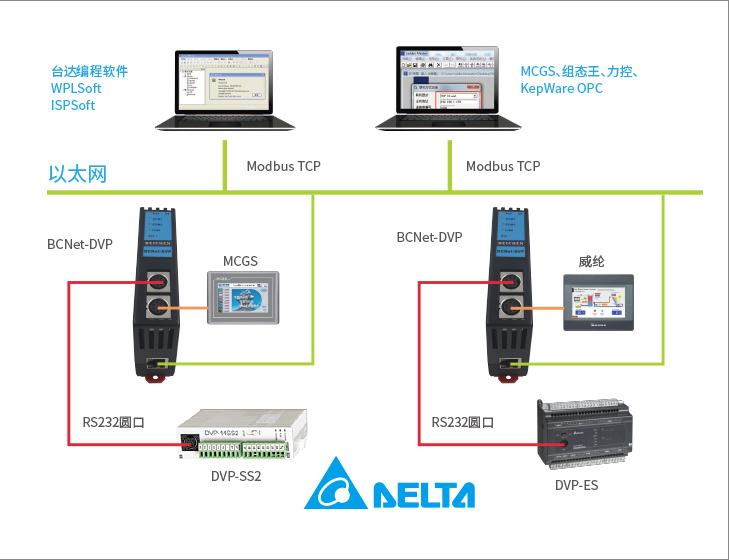 5、支持臺達以太網(wǎng)協(xié)議通信,可以通過上位機系統(tǒng)對可編程控制器進行軟元件數(shù)據(jù)的讀出/寫入,通過上位機軟件(組態(tài)王、KepWare OPC服務器等)選擇臺達以太網(wǎng)驅(qū)動后,方便快捷訪問。