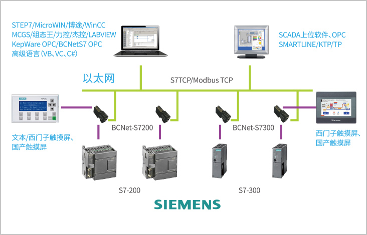 BCNet-S7200支持工控領(lǐng)域內(nèi)絕大多數(shù)SCADA軟件,支持西門子S7TCP以太網(wǎng)協(xié)議和ModbusTCP協(xié)議。