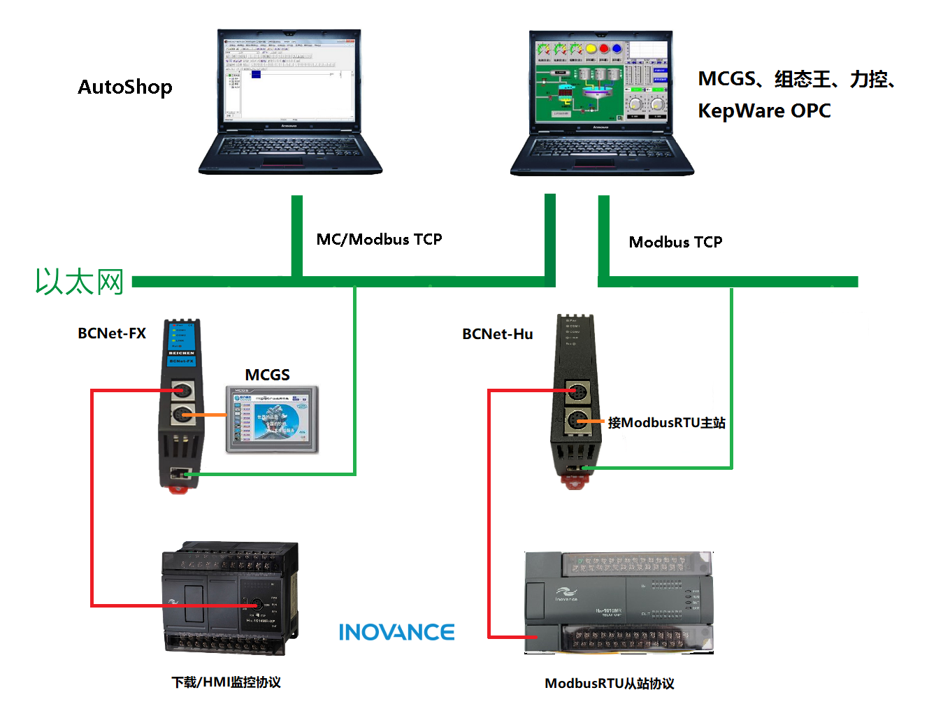 產(chǎn)品簡(jiǎn)介 BCNet-HU是一款經(jīng)濟(jì)型的以太網(wǎng)通訊處理器,是為滿(mǎn)足日益增多的工廠(chǎng)設(shè)備信息化需求(設(shè)備網(wǎng)絡(luò)監(jiān)控和生產(chǎn)管理)而設(shè)計(jì),用于串口通訊參數(shù)配置是Modbus RTU從站的匯川HnU系列PLC的以太網(wǎng)數(shù)據(jù)采集,非常方便構(gòu)建生產(chǎn)管理系統(tǒng)。若匯川HnU系列PLC串口通訊參數(shù)配置是下載/HMI監(jiān)控協(xié)議,則選BCNet-FX。匯川緊湊型EASY系列小型PLC,可選網(wǎng)絡(luò)耦合器BCNet-NAT或BCNet-MB。