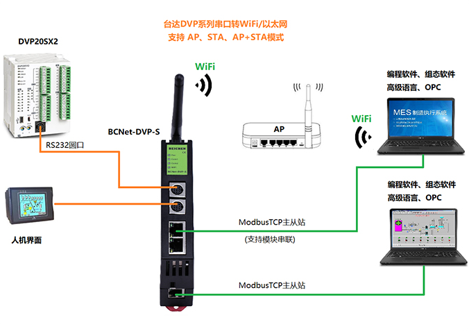 產(chǎn)品簡介 BCNet-DVP-S用于臺達(dá)DVP系列PLC的以太網(wǎng)數(shù)據(jù)采集,非常方便構(gòu)建生產(chǎn)管理系統(tǒng)。模塊集成WiFi功能,支持AP模式、STA模式和AP+STA模式,帶膠棒和磁吸天線,方便構(gòu)建WiFi網(wǎng)絡(luò),直接通過WiFi進(jìn)行PLC編程、數(shù)據(jù)采集。?BCNet-DVP-S采用即插即用設(shè)計,不占用PLC通訊口,即編程軟件/上位機軟件通過以太網(wǎng)對PLC數(shù)據(jù)監(jiān)控的同時,觸摸屏可以通過復(fù)用接口與PLC進(jìn)行通訊,支持工控領(lǐng)域內(nèi)絕大多數(shù)SCADA軟件,支持臺達(dá)以太網(wǎng)協(xié)議和ModbusTCP通訊方式。