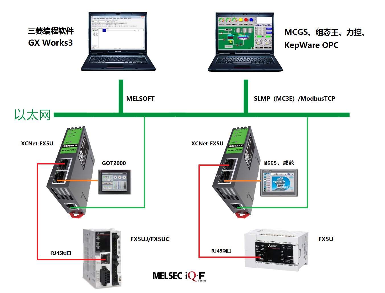 XCNet-FX5U是一款高性能協議轉換網關,是為滿足日益增多的工廠設備信息化需求(設備網絡監(jiān)控和生產管理)而設計,用于三菱MELSEC iQ-F(FX5U、FX5UJ和FX5UC)系列PLC的以太網數據采集,非常方便構建生產管理系統。
