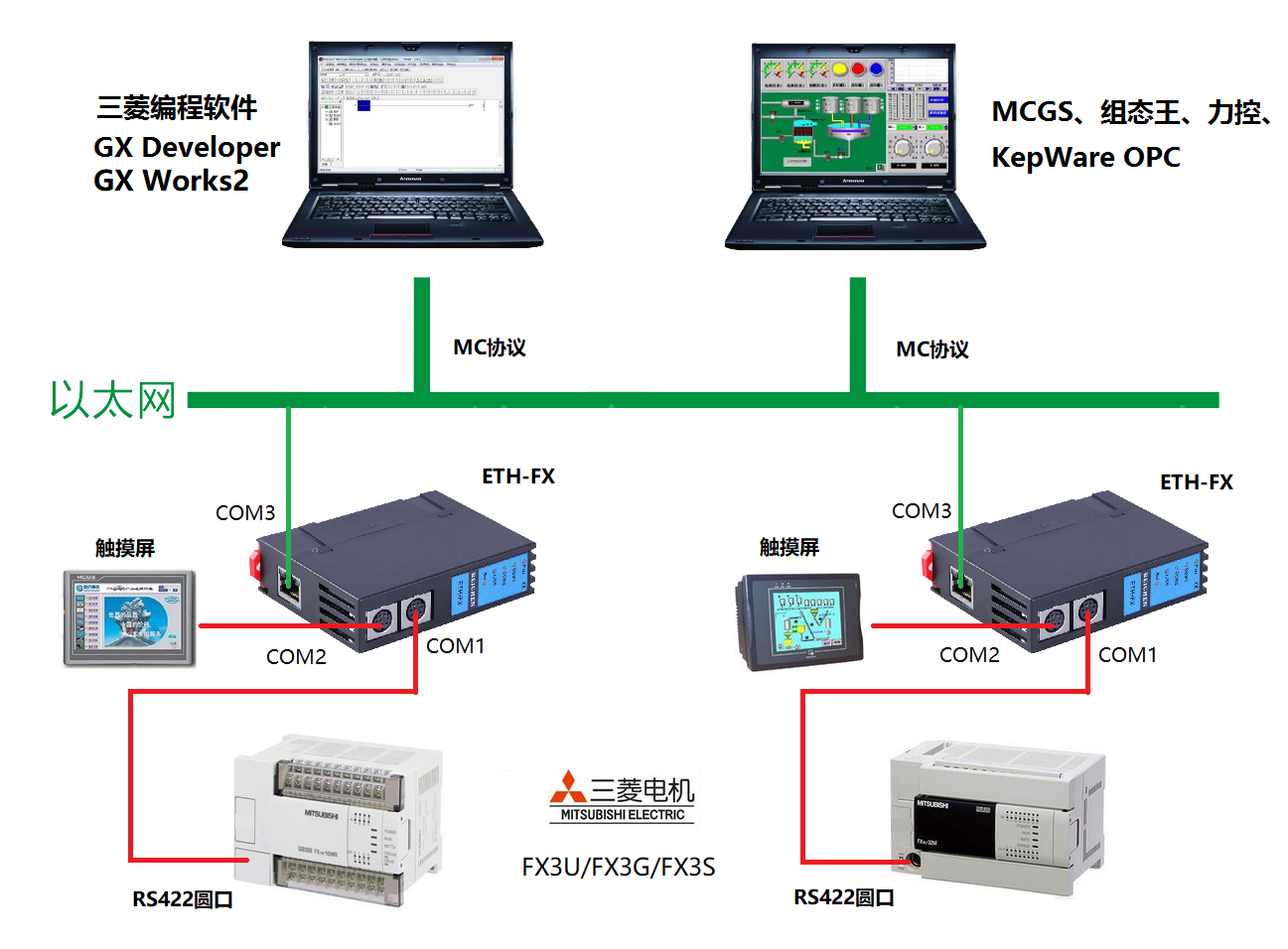 ETH-FX是BCNet-FX的經(jīng)濟款,可將三菱FX3U/FX3G/FX3S系列PLC的RS422編程圓口擴展為2個RS422編程圓口和1個以太網(wǎng)接口。擴展的圓口,可以連觸摸屏,擴展的以太網(wǎng)接口支持MC協(xié)議(BCNet-FX同時支持MC協(xié)議和ModbusTCP協(xié)議),支持以太網(wǎng)編程、程序上下載和上位軟件監(jiān)控。