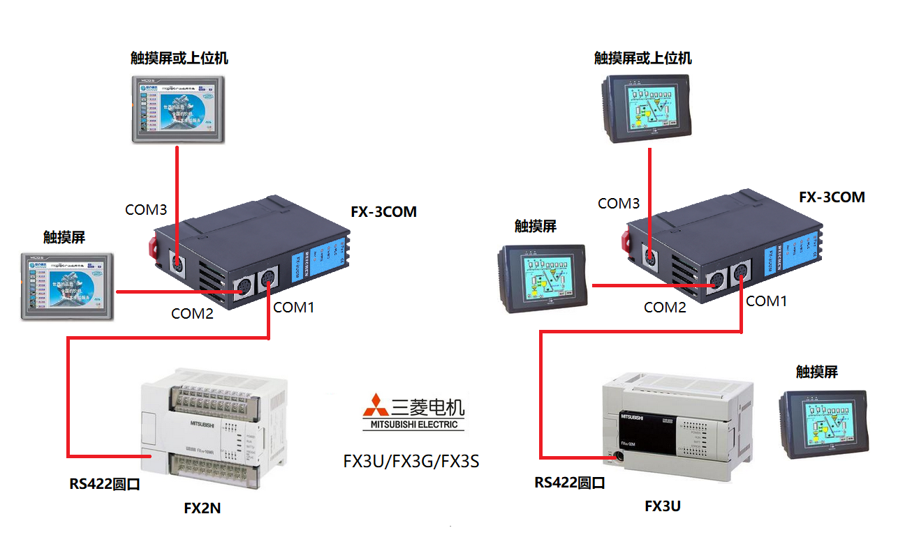 FX-3COM可將三菱FX3U/FX3G/FX3S的1個RS422編程圓口擴展為3個RS422編程圓口,擴展的圓口可用于觸摸屏、上位機通訊。