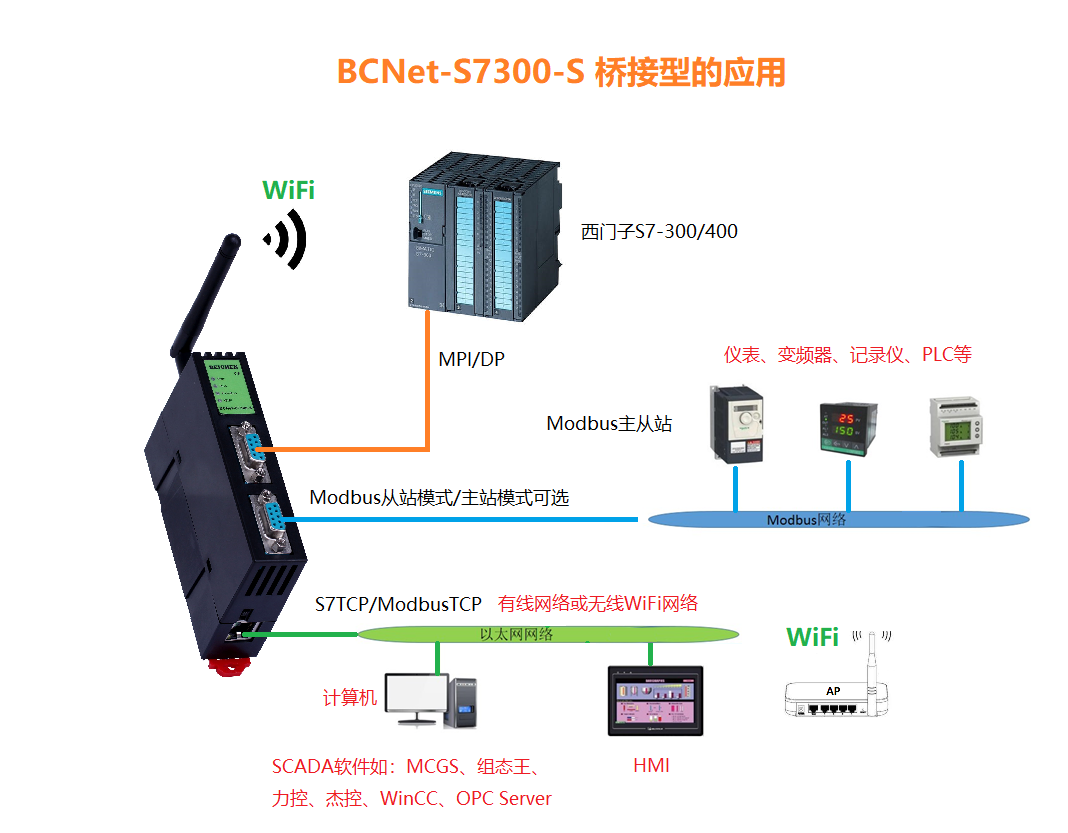 7、支持與S7-200、S7-200SMART 、S7-1200/1500、S7-300、S7-400的以太網(wǎng)接口進(jìn)行通訊的功能和ModbusTCP主從站功能。