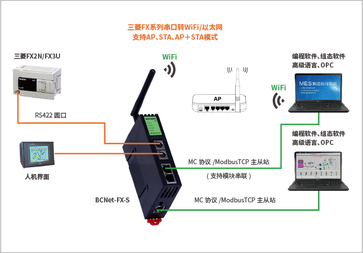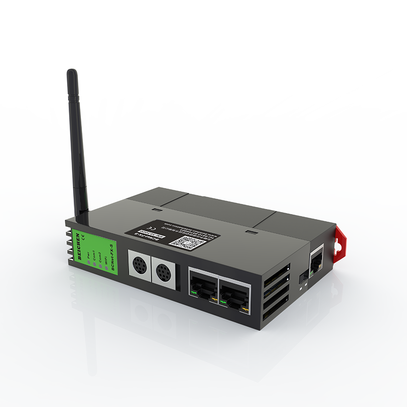 產(chǎn)品簡介 BCNet-FX-S用于三菱FX1S/1N/2N/3S/3G/3GA/3GC/3U/3UC系列、匯川、士林AX、禾川、維控等PLC以太網(wǎng)數(shù)據(jù)采集,非常方便構(gòu)建生產(chǎn)管理系統(tǒng)。模塊集成WiFi功能,支持AP模式、STA模式和AP+STA模式,帶膠棒和磁吸天線,方便構(gòu)建WiFi網(wǎng)絡,直接通過WiFi進行PLC編程、數(shù)據(jù)采集。不占用PLC編程口,上位機通過以太網(wǎng)對PLC數(shù)據(jù)監(jiān)控的同時,觸摸屏可以通過復用接口X2與PLC進行通訊。支持工控領(lǐng)域內(nèi)絕大多數(shù)SCADA軟件,支持三菱MC以太網(wǎng)協(xié)議和ModbusTCP主從站通訊。 支持點表探測功能。