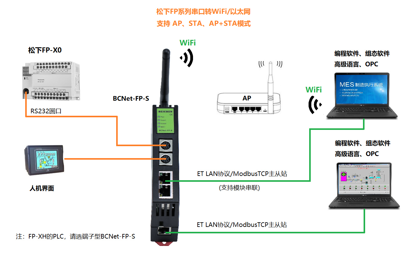 BCNet-FP-S用于松下FP-XH、FP-X、FP-X0、FP0、FP0R、FP2SH系列PLC的以太網(wǎng)數(shù)據(jù)采集,非常方便構(gòu)建生產(chǎn)管理系統(tǒng)。模塊集成WiFi功能,支持AP模式、STA模式和AP+STA模式,帶膠棒和磁吸天線,方便構(gòu)建WiFi網(wǎng)絡(luò),直接通過WiFi進(jìn)行PLC編程、數(shù)據(jù)采集。