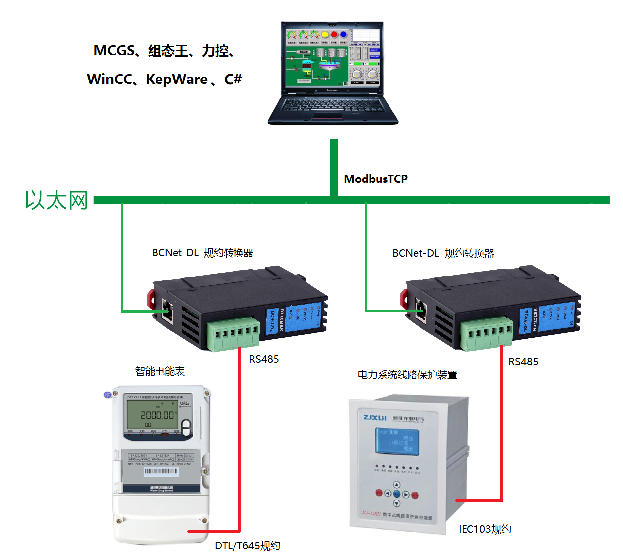 BCNet-DL是一款面向電能表及電力系統(tǒng)線路保護(hù)裝置的協(xié)議轉(zhuǎn)換器。該協(xié)議轉(zhuǎn)換器可將DL/T645-2007、DL/T645-1997及IEC103規(guī)約的電能表及電力系統(tǒng)線路保護(hù)裝置的串口協(xié)議轉(zhuǎn)換成ModbusTCP協(xié)議,通過(guò)以太網(wǎng)進(jìn)行數(shù)據(jù)采集和監(jiān)控。