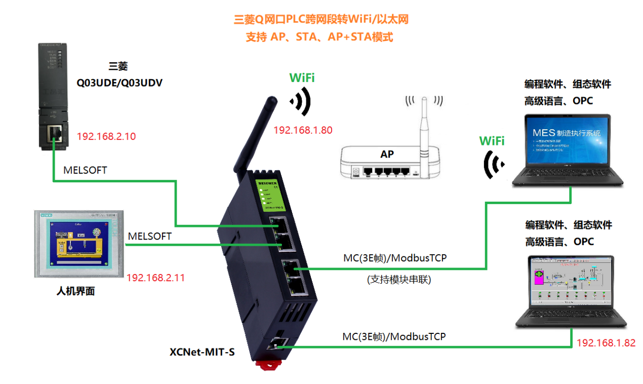 XCNet-MIT-S具備LAN1、LAN2兩個物理性接口,可將LAN1口所連接PLC的IP地址和端口號,映射到LAN2口的任意IP和端口號。XCNet-MIT-S可將LAN1口的三菱MELSOFT協(xié)議自動映射成LAN2口的ModbusTCP協(xié)議和MC(3E幀)服務(wù)器。 模塊集成WiFi功能,支持AP模式、STA模式和AP+STA模式,帶膠棒和磁吸天線,方便構(gòu)建WiFi網(wǎng)絡(luò),直接通過WiFi進行PLC編程、數(shù)據(jù)采集、數(shù)據(jù)交換和跨網(wǎng)段訪問。